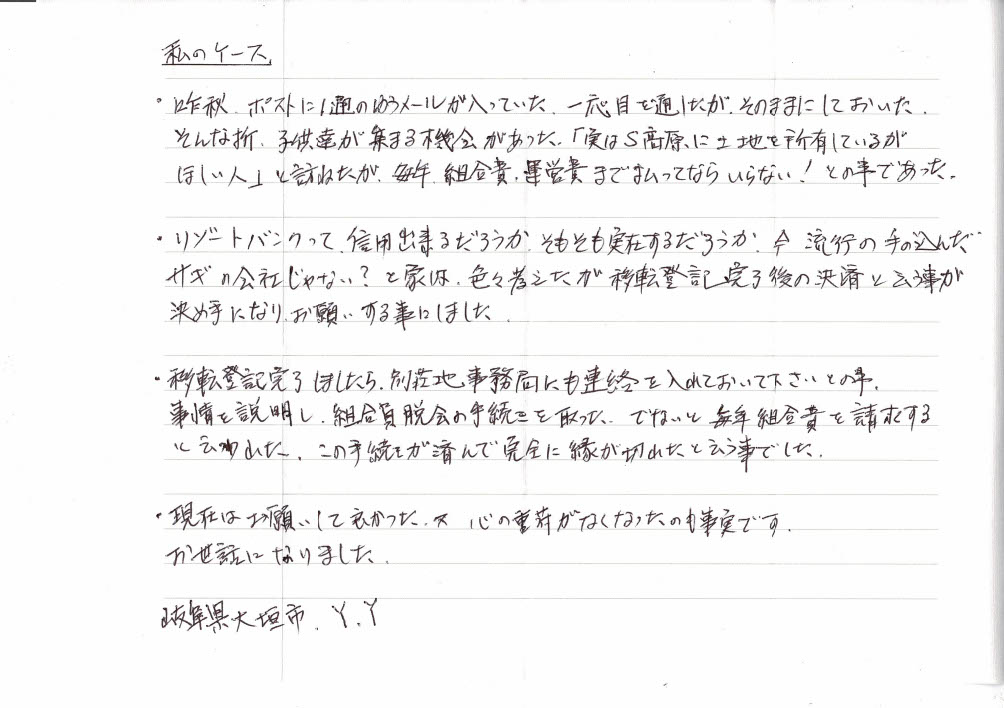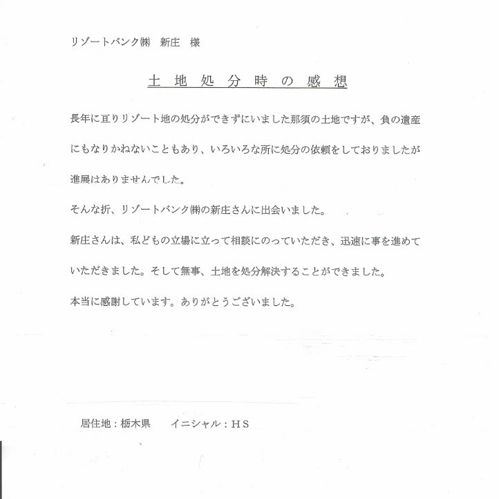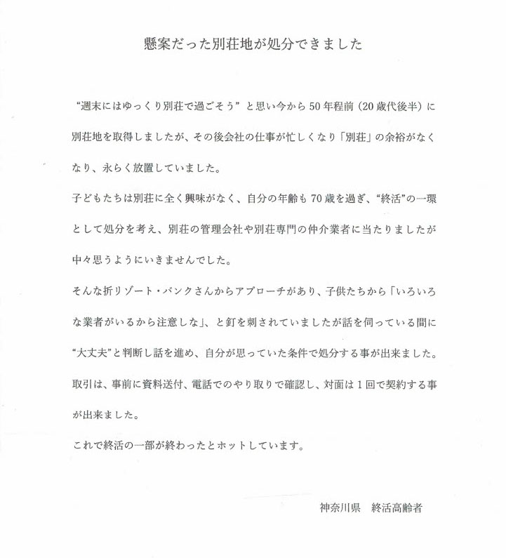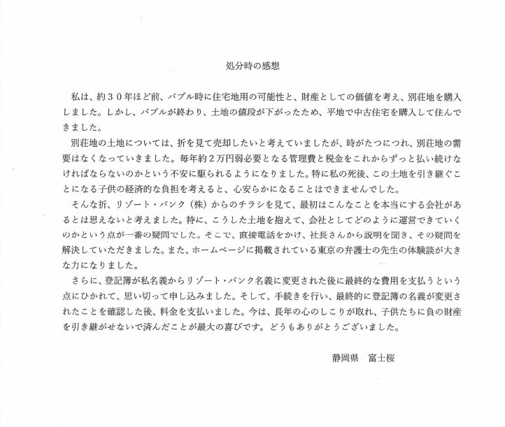 『リゾート物件買取り処分』ご利用者様のお言葉